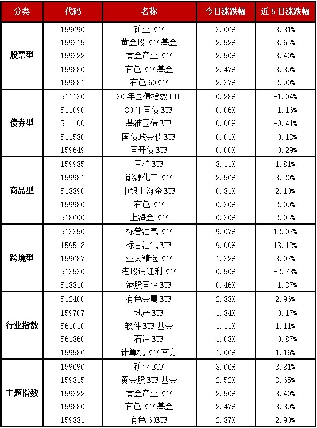 2. 涨幅靠前的ETF产品今日不同类型ETF产品中走势排名前5的基金如下表所示,其中,股票型ETF涨幅最高的3只ETF产品分别为矿业ETF(159690)、黄金股ETF基金(159315)、黄金产业ETF(159322),今日收益率分别为3.06%、2.52%和2.50%。