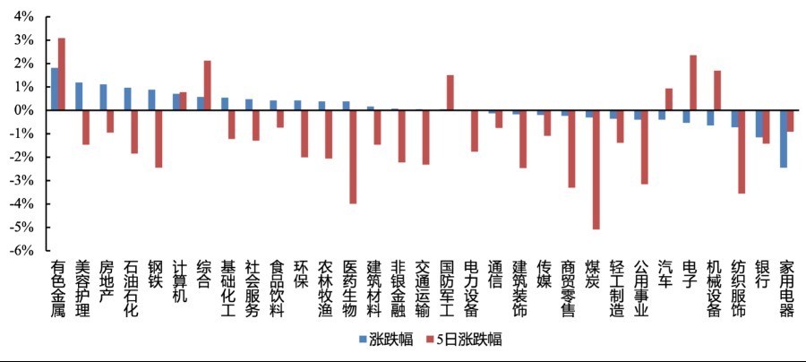 2. 板块表现统计全部申万一级行业今日涨跌幅情况,有色金属、美容护理、房地产今日走势排名靠前,日涨跌幅分别为1.81%、1.19%和1.12%,纺织服饰、银行、家用电器的走势排名靠后,日涨跌幅分别是-0.72%、-1.16%和-2.45%;近5个交易日有色金属、电子、综合的走势排名靠前,近5日涨跌幅分别为3.08%、2.35%和2.13%,纺织服饰、医药生物、煤炭的走势排名靠后,近5日涨跌幅分别为-3.56%、-3.99%和-5.09%。