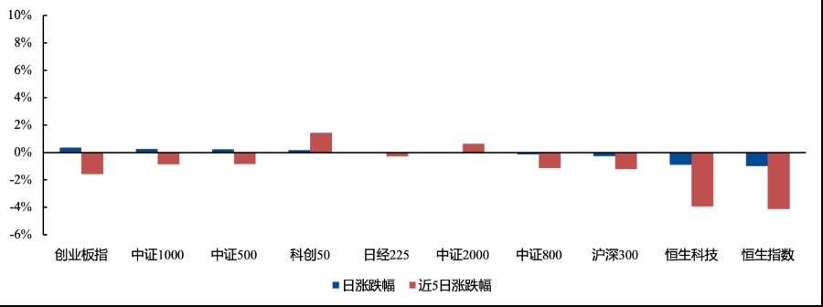 今日创业板指、中证1000、中证500走势排名靠前,日涨跌幅分别为0.36%、0.26%和0.23%;近5个交易日科创50、中证2000、日经225的走势排名靠前,近5日涨跌幅分别为1.44%、0.63%和-0.30%。