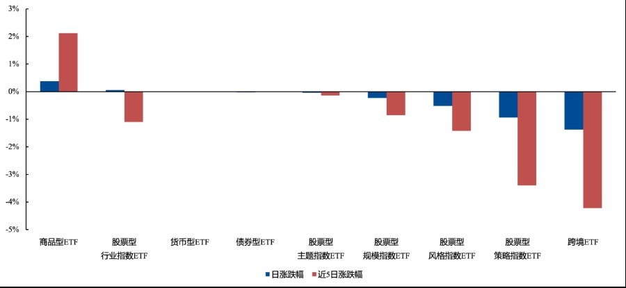 三、ETF市场表现1. ETF总体概览根据ETF基金的规模和涨跌幅计算得出不同分类情况下各类ETF基金的加权平均涨跌幅。今日,商品型ETF表现最优,该类ETF的加权平均涨跌幅为0.38%;跨境ETF的表现最差,该类ETF的加权平均涨跌幅为-1.38%。